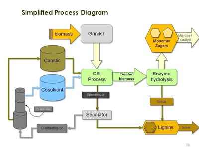 The Cellulose Sciences process has already been demonstrated on corn stover, sugarcane bagasse, switchgrass, and hardwoods. We are currently in the planning stages for a pilot plant. Shown below is a simplified diagram of the process as applied to biomass.