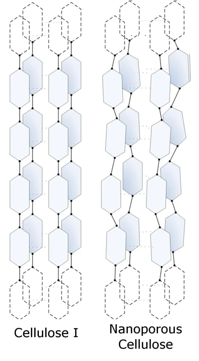 The diagram at right shows a very simplified representation of nanoporous cellulose at the molecular level.